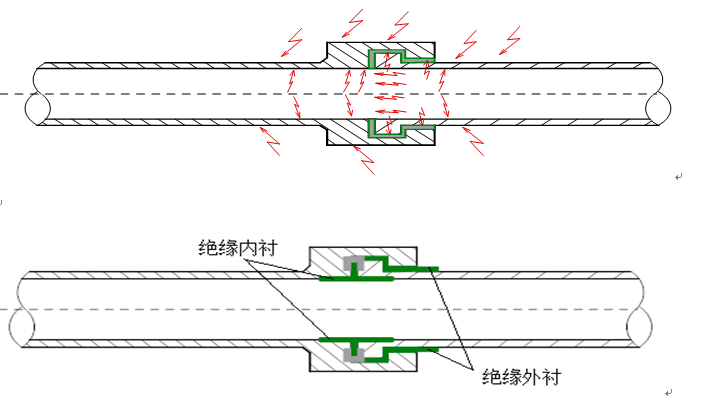 公司采用了意大利努瓦金公司開發(fā)了一套全新的、完整的橫向和縱向密封/絕緣系統(tǒng)。此系統(tǒng)完美的利用了金屬結構的特性,很好的阻斷了電流的擴散/干擾。此套系統(tǒng)可以單獨使用并具有非常良好的絕緣效果,也可以結合常規(guī)的或傳統(tǒng)的方法,與絕緣涂層和內(nèi)襯同時使用,以應對各種惡劣環(huán)境,使絕緣接頭不受損壞。此產(chǎn)品采用我們已經(jīng)試驗成功的DSGS 密封系統(tǒng)設計和生產(chǎn),它是一個在結構上能夠對抗各個方向電流流失/干擾的固體絕緣系統(tǒng)。采用這種結構的產(chǎn)品具有非常良好的絕緣特性。如下圖: